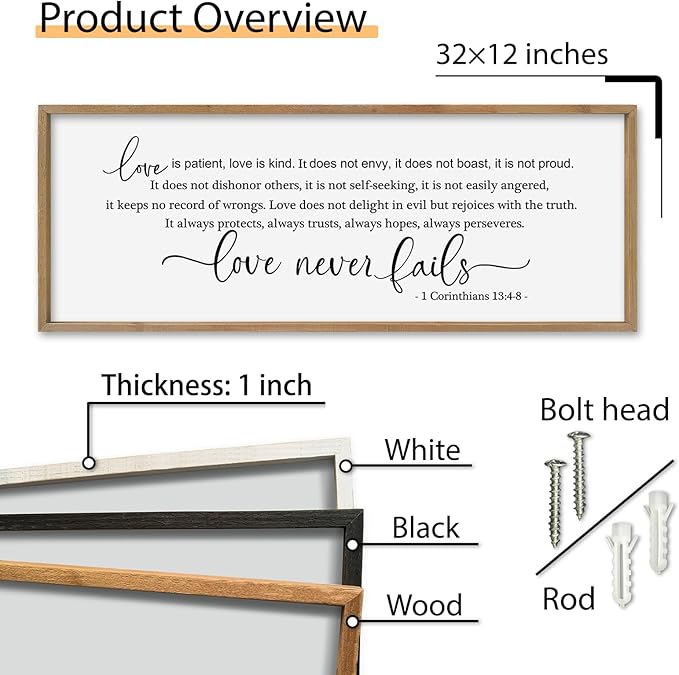 SRSZHIYUE Love is Patient Kind Sign Wall Decor Art 32"×12" 1 Corinthians 13 4-8 Master Bedroom Christian Wood Framed Large Wall Hanging (Wood)