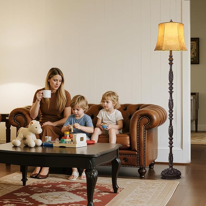 - RETRO FLOOR LAMP: Floor lamp has retro design, exquisite carved patterns resin body with dark brown finish, non-fading, solid construction, adds a warm, vintage charm that fits perfectly with retro style decor. Sturdy floor lamp, blending traditional elements and aesthetics, lights up your room space