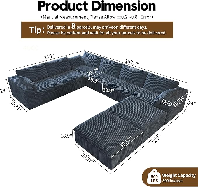 - Tips: 8 Boxes Packaging and sometimes they arrive at different times.Due to the sponge rebound, when just unpacked, the size may deviate from the picture size, after 72 hours of resting, the product size will be restored to the size of the picture If you have any questions about your cloud couch or need assistance, please reach out to us as soon as possible.