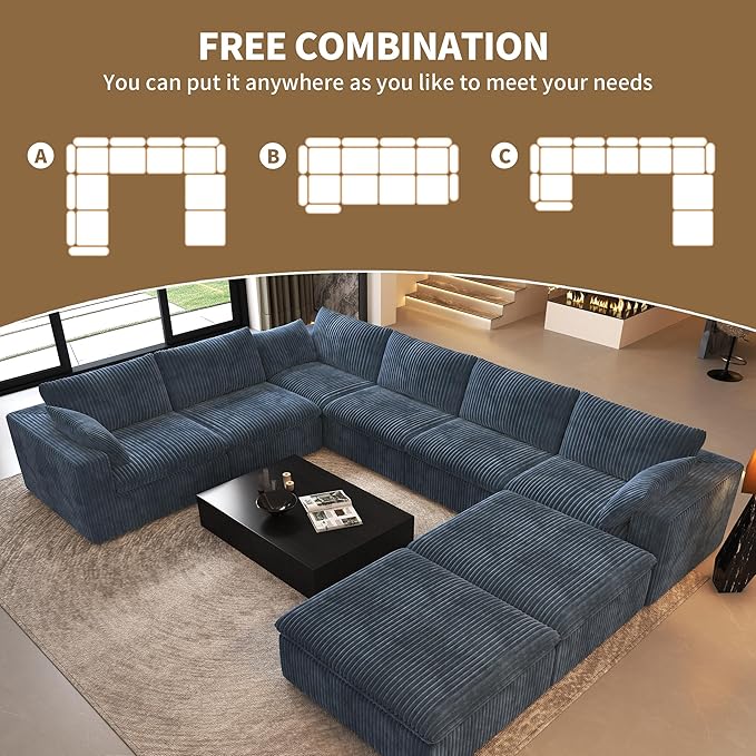 Oversized Modular Sectional Cloud Couch,157.5" U Shaped Modern Sofa with 2 Ottoman and 2 Middle Seats,Upholstered Couches with Corduroy Fabric for Living Room Furniture,No Assembly Required,Blue