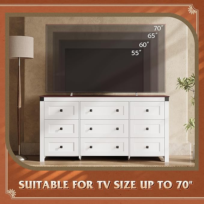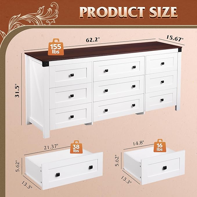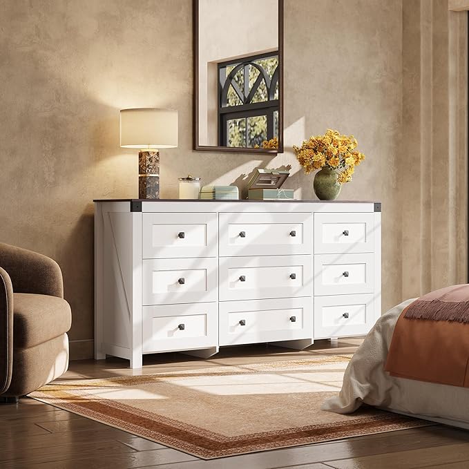 - đăFarmhouse 9 Drawers DresserăThis wooden dresser features a white with a brown wood top, retro square handle adds a rustic charm, simple design exudes warmth and comfort, can be used for bedroom clothing organizer, entryway table, decorative storage for living room.