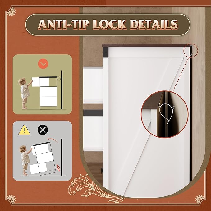 - đăSafe and SturdyăThe bedroom dresser is crafted from durable engineered wood, ensuring long-term use and scratch resistance. Each wood drawer can hold up to 30lbs, and the wood tabletop can hold up to 155lbs. Equipped with an anti-tipping device, effectively preventing shaking or tipping over, keeping family members and pets safe.