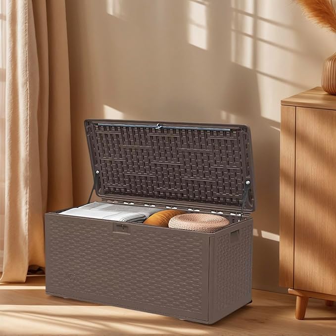 73 Gallon Large Storage Box with Lid,Waterproof Outdoor Storage Container for Patio Furniture Cushions, Gardening Tools, Pool Accessories, Lockable Resin Deck Box with handle Brown