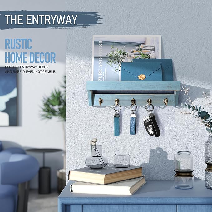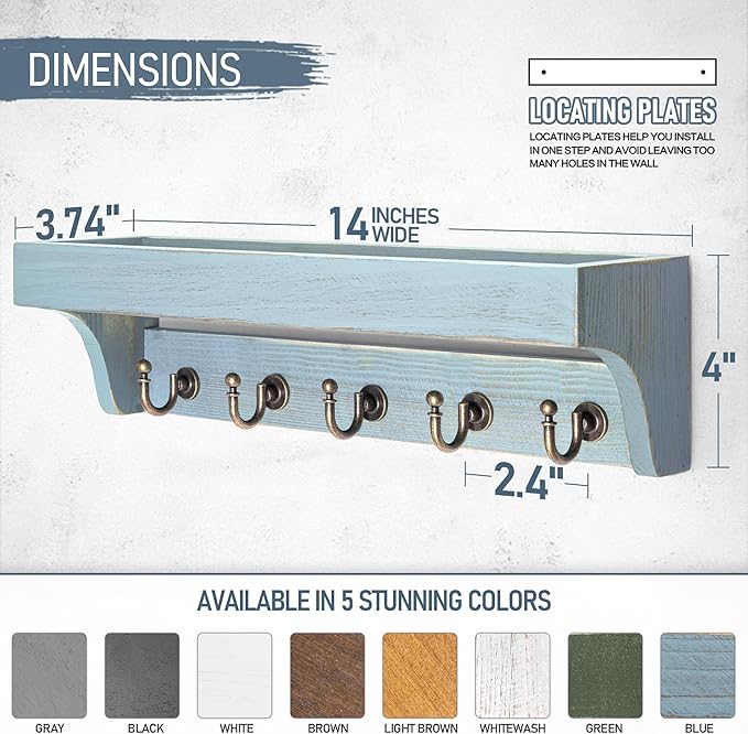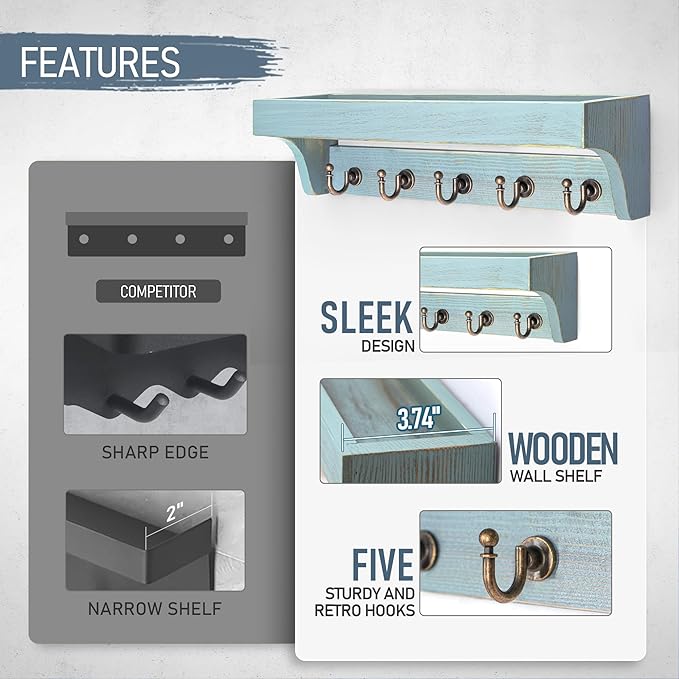 - [14" WIDTH SHELF] This 14-inch wide distressed blue floating shelf, paired with 5 sturdy hooks, offers ample storage space to keep small items organized—perfect for keys, mail, masks, glasses, pet leashes, framed photos, travel souvenirs, and other small vital home essentials.