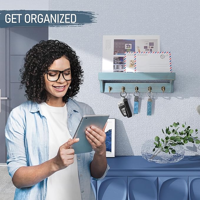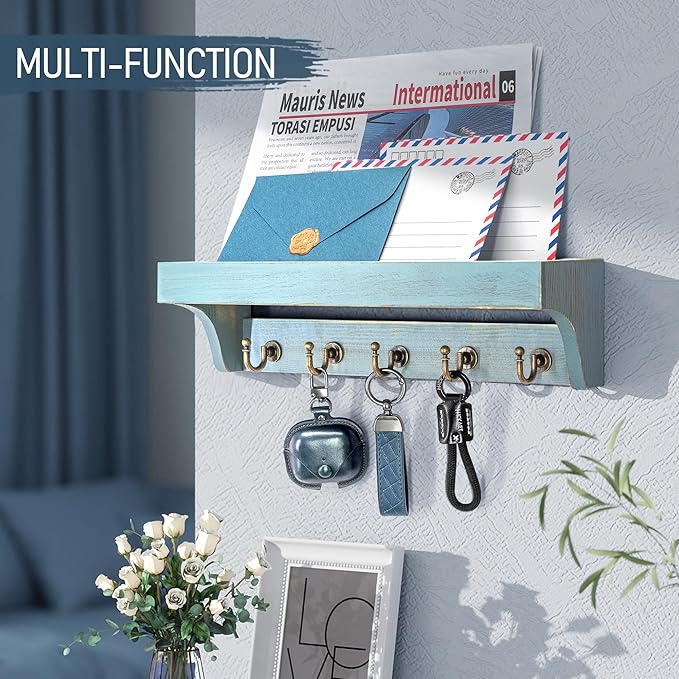 - [UPGRADED BRIGHT HOOKS] Sturdy and fashion Room Decor Key Organizer Wall Mount, with bright key hooks enhance the fashion of our key and mail holder for wall. Five decorative hooks on a modern blue key hanger hold dog leashes, purse, jackets and more.