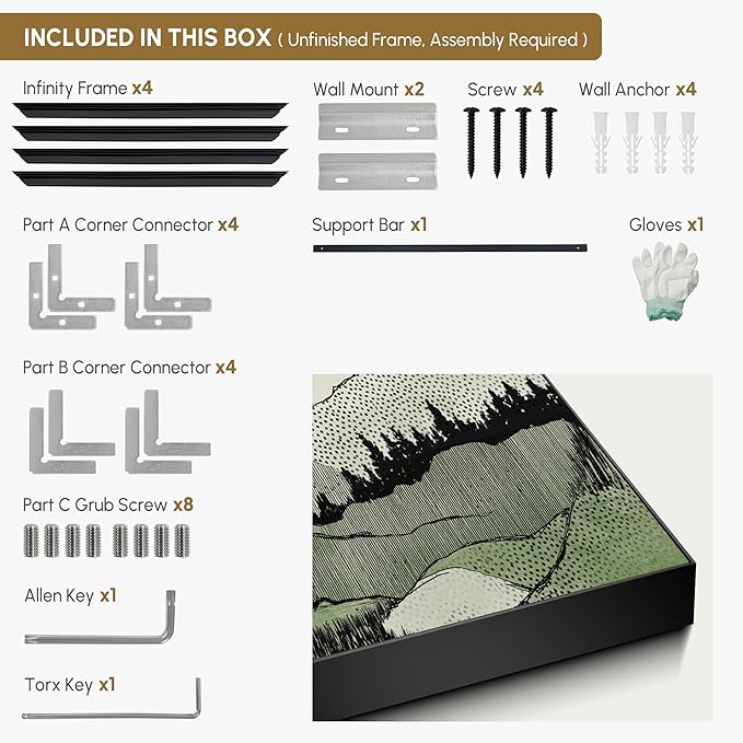 - Assembly Required: The artwork comes with the frame components unassembled. Don¡¯t worry - setup is straightforward and tool-friendly. For best results and accurate alignment, we recommend two people to ensure a smooth assembly and a stable, secure wall mount.