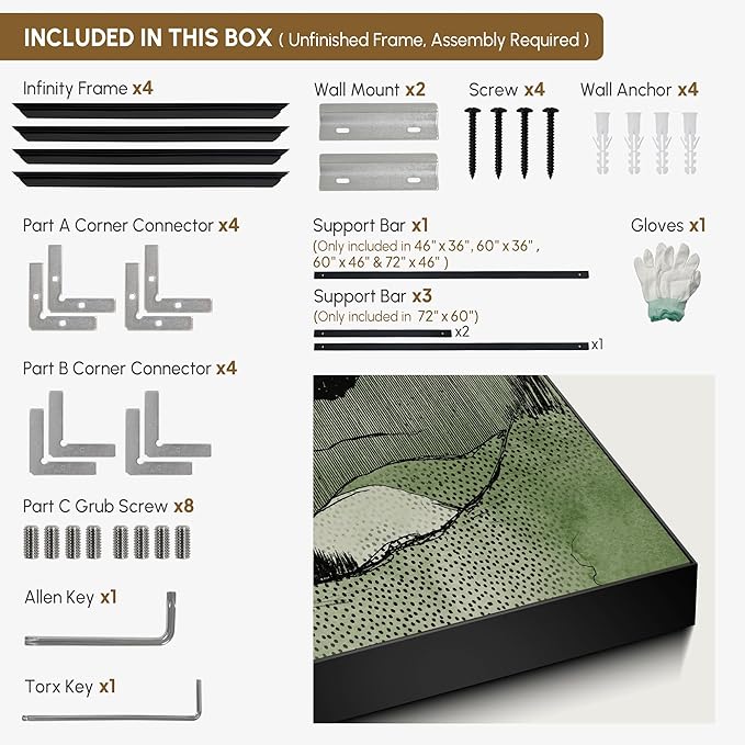 - Assembly Required: The artwork comes with the frame components unassembled. Don¡¯t worry - setup is straightforward and tool-friendly. For best results and accurate alignment, we recommend two people to ensure a smooth assembly and a stable, secure wall mount.