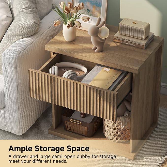 - Wave-Pattern Design: elegant 3D wave detailing on drawer fronts for a sophisticated, tactile experience that effortlessly matches any bedroom aesthetic. The natural wood nightstand matte laminate resists stains and easy to wipe clean.