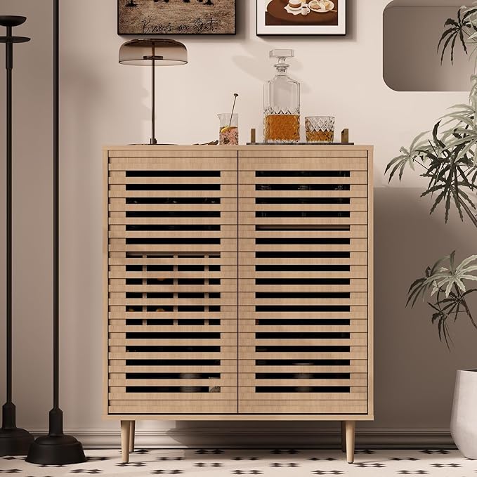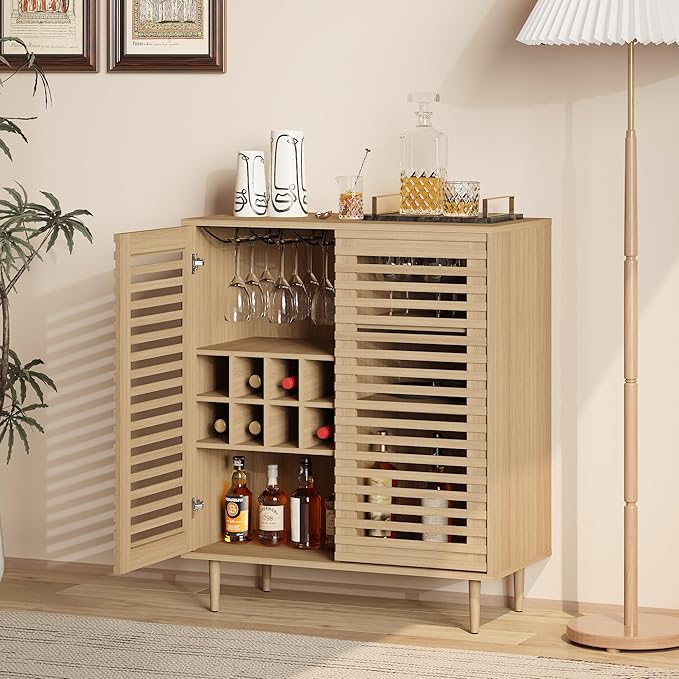 Mid Century Bar Cabinet with Wine Racks, Modern Liquor Cabinet with Slatted Doors for Dining Room, Living Room (Natural Color)