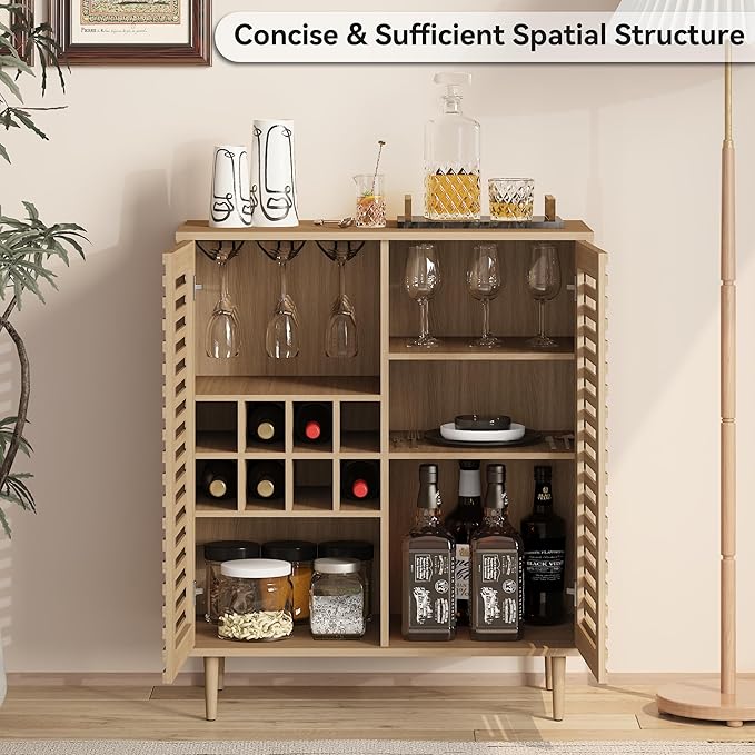 - Elegant Design: The wine cabinet Crafted from wood with clean lines and slatted doors,can easily see what you want,this wine bar cabinet adds a touch of mid-century modern charm to any space.