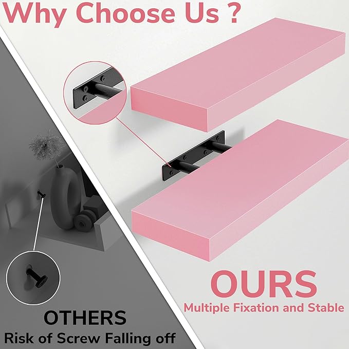 - Charming Pink Home Decor: Enhance your home's aesthetic with these modern floating shelves for wall. The soft pink finish and invisible brackets create a sleek, minimalist look, adding a touch of elegance to any room, perfect for creating a stylish gallery wall in your bedroom, living room, or nursery to display photo frames, art, and decor.