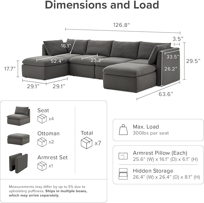 - Disclaimers: Colors may vary due to lighting and screen differences. Cushions are vacuum-packed and may take up to 7 days to fully expand. For best results, gently fluff and allow time to reach full volume. Measurements may differ by up to 5% due to upholstery puffiness. Ships in multiple boxes, which may arrive separately