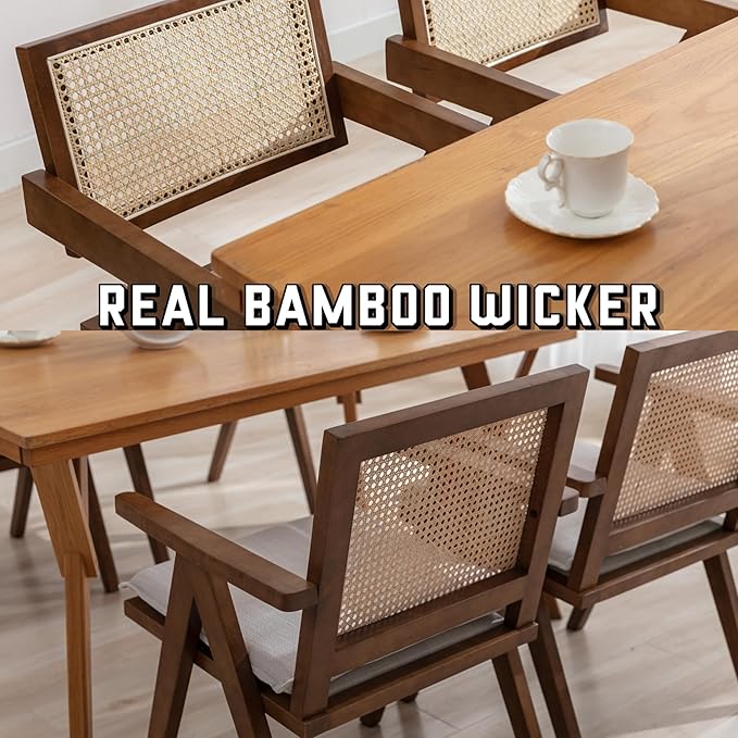 Rattan Dining Chairs Set of 6, Farmhouse Wicker Dining Chairs with Removable Linen Cushion Accent Cane Armchair for Dining Room Kitchen Restaurant, Walnut