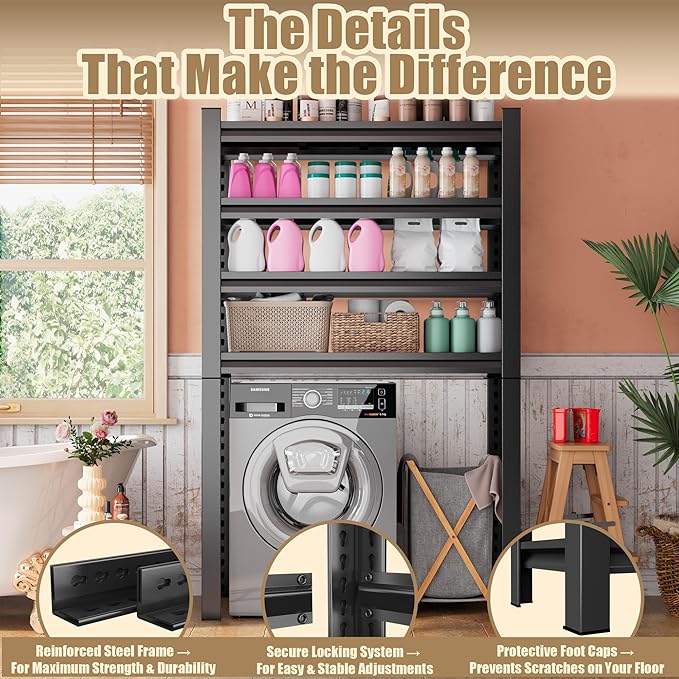 - ✅ CUSTOMIZABLE & VERSATILE FOR ANY HOME While it's the ideal choice for over washer and dryer shelves, its simple, clean design and adjustable nature make it a versatile asset for your entire home. Should your needs change, this unit easily adapts for use in the pantry, basement, or garage. It’s not just a purchase for today; it's a flexible storage investment that grows and moves with you, providing lasting value.