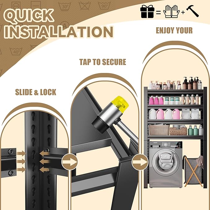- ✅ FRUSTRATION-FREE, NO-BOLT ASSEMBLY Get organized in minutes, not hours! This washer dryer shelf features an innovative rivet-lock design that snaps together easily, often without any nuts or bolts. We even include a rubber mallet to make setup a breeze. You'll have this sturdy, free-standing structure assembled and ready to declutter your space long before the next laundry cycle finishes. It's the most user-friendly laundry room shelving units you'll ever own.