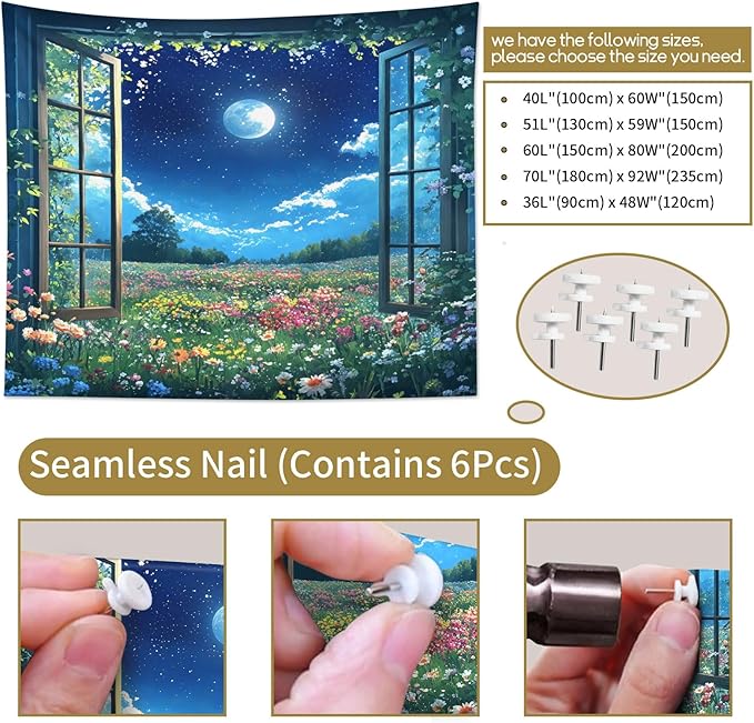 LB Wildflower Moon Tapestry, Green Plant Outside Window and Colorful Floral Wall Tapestry for Bedroom, Garden Wall Art for Living Room Dorm Home Decor Ready to Hanging, 92.5 x 70.9 Inches