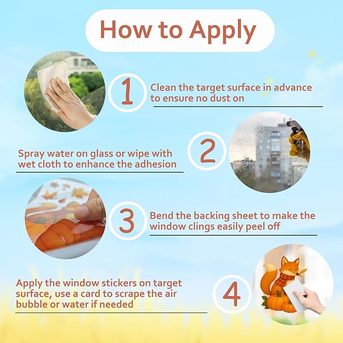 - đťEasy to Apply and Remove: Different from common window stickers with adhesion on, the static window clings is easy to be peeled off when you bend the edge of sticker on backing paper, then stick them on pre-treated window with wet cloth. No residue left on the glass when remove.
