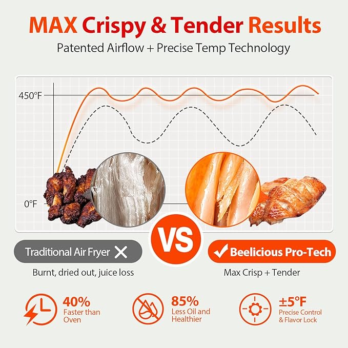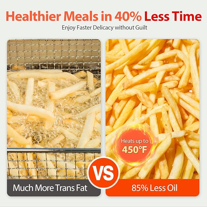 - 【Healthier Meal in Minutes】With industry-leading temperatures up to 450°F and unique metal chamber design, this air fryer heats 40% faster than traditional oven, and up to 85%-90% less oil healthy results every time!