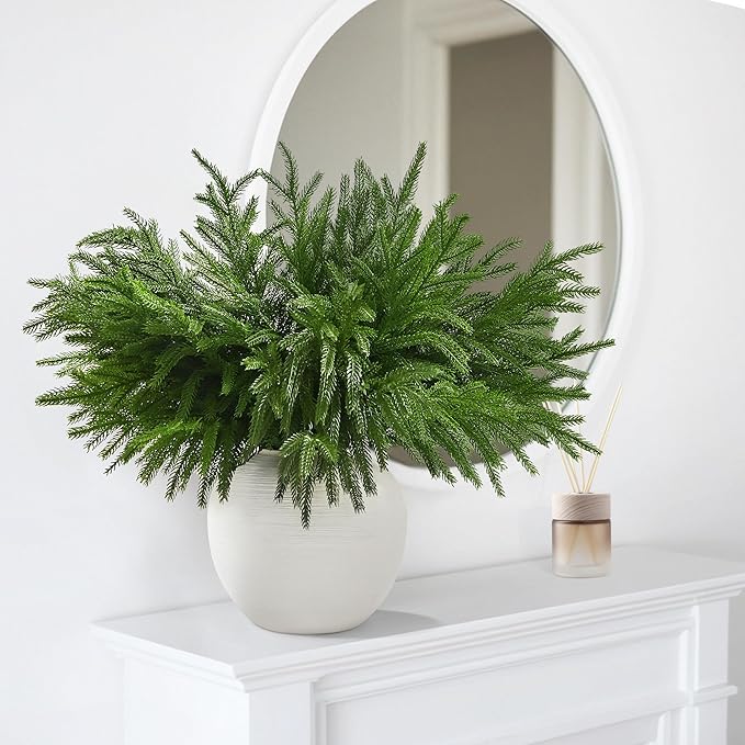 - Quantity and Size: With 16pcs Norfolk pine stems included in each bulk purchase, you have sufficient artificial pine branches to create stunning arrangements throughout your home. Each Norfolk Pine Branch is about 18 Inches and made of soft plastic which make these Norfolk pine stems hung down naturally. It is perfect Christmas greenery for vase filler and Christmas centerpieces for tables.