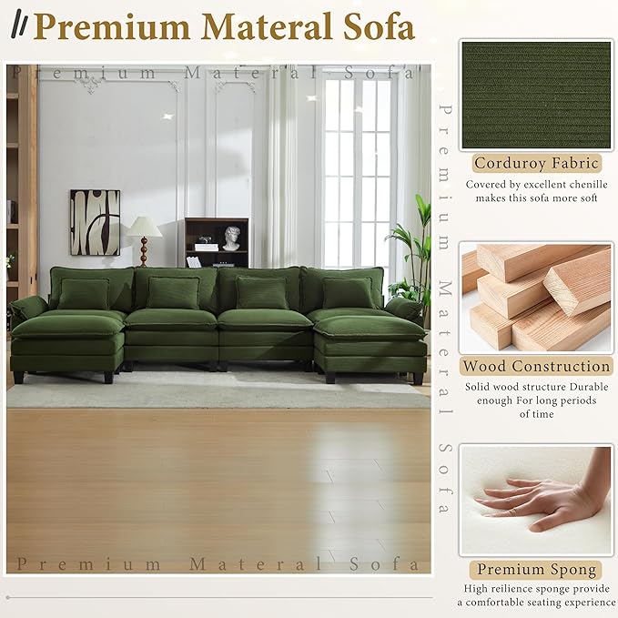 URRED Modular Sectional Sofa Comfy Cloud Couch, Modern Corduroy Sofa Sleeper Deep Seat Couches with Ottoman/Pillows for Living Room (Green, 154'' - U Shape)
