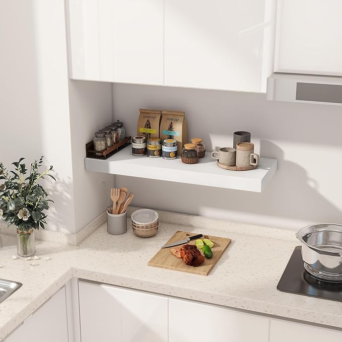 - 【DECORATIVE & FUNCTIONAL】The wall-mounted floating shelves are designed for decoration and storage, utilizing and decorating any space in your home. Used as shelf decor to show your collection, books, or prize, the hanging shelves are perfect for displaying your photo frame, small plants, model, or audio in your living room, office, study. And can also use as over the toilet storage shelf in the bathroom to hold toiletries or used as kitchen shelf to storage condiments.
