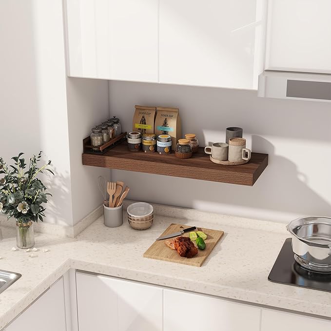 - 【FARMHOUSE RUSTIC WALL SHELF】These floating shelves are made of premium engineered wood board and invisible one-piece bracket. The rustic wooden grain surface add character and warmth to any modern or traditional interior with these thick floating shelves, contrast shelves at staggering heights on the wall or mount side-by-side or in the corner for a clean streamlined look.