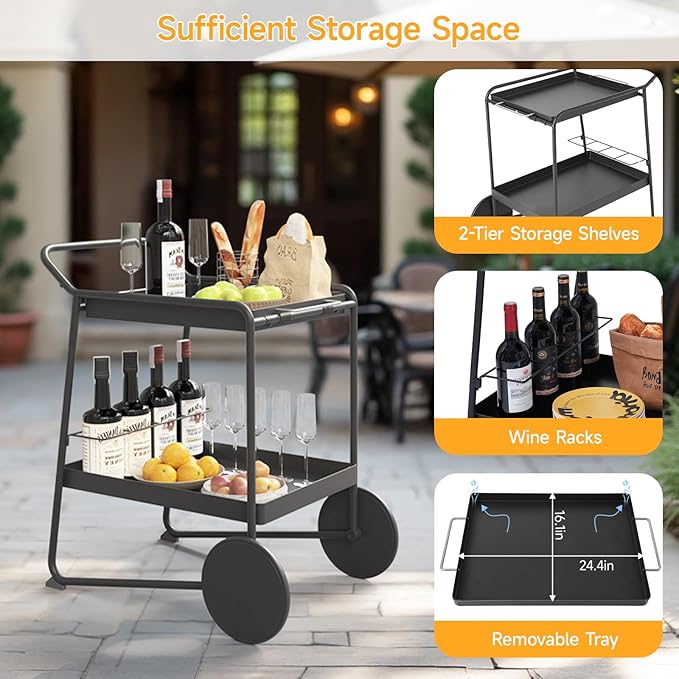 - Sturdy and Durable: The outdoor bar cart features a robust construction with both the frame and trays crafted from premium-quality steel, ensuring superior strength and durability. The cart undergoes dual-process treatment including galvanization and powder coating, significantly helping the cart withstand rust for reliable all-weather outdoor use. This specialized surface treatment extends the product's lifespan.