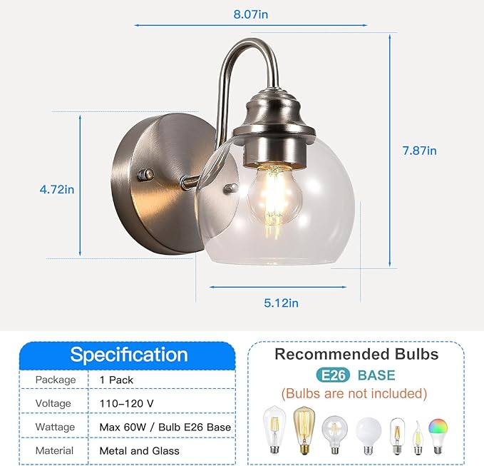 - γStandard E26 Baseγ: Our bath vanity light fixtures set require 2 x E26 medium base bulbs (Max 60W for each light, Bulbs not included). This wall lamp areCompatible with smart bulbs and dimming bulbs (without smart and dimming functions). 2700K warm white bulbs brings you relaxing and welcoming feeling, however 5000K daylight white bulb give you clean and energetic enjoyment (Max. 60W, Hardwire 120V)