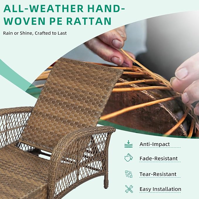 - Durable & Weather-Resistant Material: Crafted with hand-woven PE rattan and a powder-coated steel frame, this patio chaise lounge and matching side table are built to withstand all weather conditions, offering long-lasting durability without fading or cracking. Light in weight but heavy on strength, the wicker lounge chair supports up to 350 pounds while weighing just 31.6 lbs