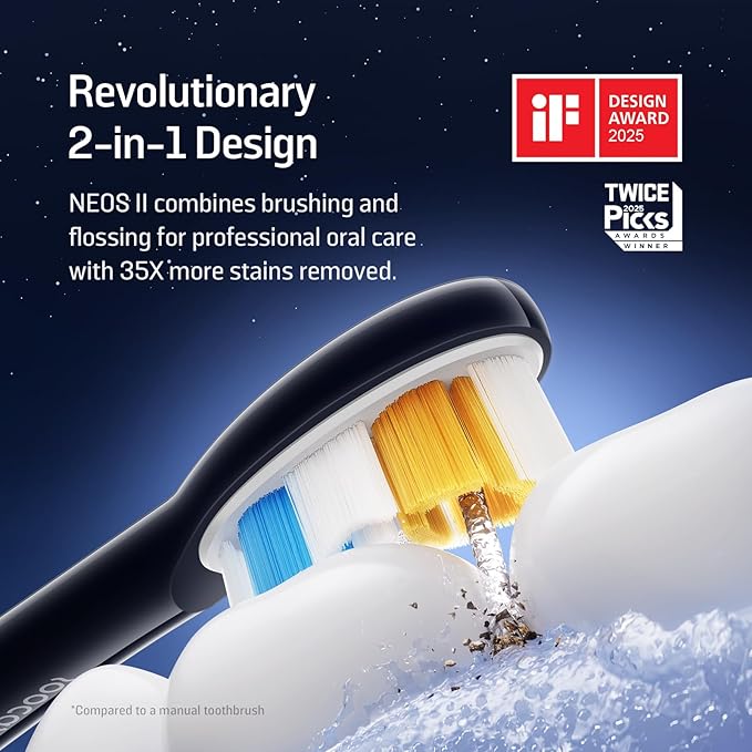 - TRAVEL-FRIENDLY: Weighing only 225g, the NEOS II features a compact, all-in-one design, making it perfect for both daily use and effortless travel—experience superior oral care anytime, anywhere.