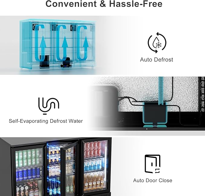 - 【Efficient Refrigeration】This 3 door commercial back bar cooler is equipped with a triple air-cooling power system, a 360° all-round air supply design, and an intelligent temperature control system to achieve automatic cooling cycle, truly achieving efficient and stable refrigeration.Supporting temperature adjustment of 32℉-50℉ to meet the refrigeration needs of various drinks;