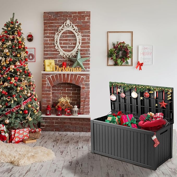 - Extra Room for Cushions & Gear. With its generous interior, this box provides extra space to fit bulky patio cushions, pool floats, or gardening supplies. Its wide-opening lid and sturdy hinges make it easy to access everything you need for outdoor relaxation or work.