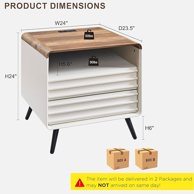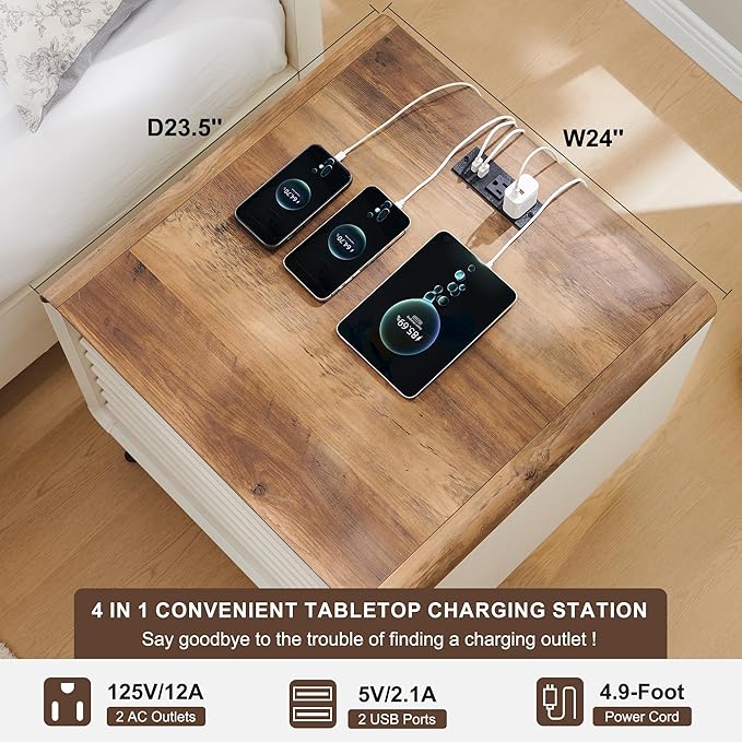 - 24-inch Desktop with Charging Station: The fluted nightstand size is 23.5W*24D*24H, providing a 24-inch square large and spacious desktop, which can place mobile phones, laptops, desk lamps and other daily necessities at the same time without crowding . In addition, the top panel of this white night stand is equipped with 2 AC sockets and 2 USB ports. Let you say goodbye to the trouble of finding a charging socket.