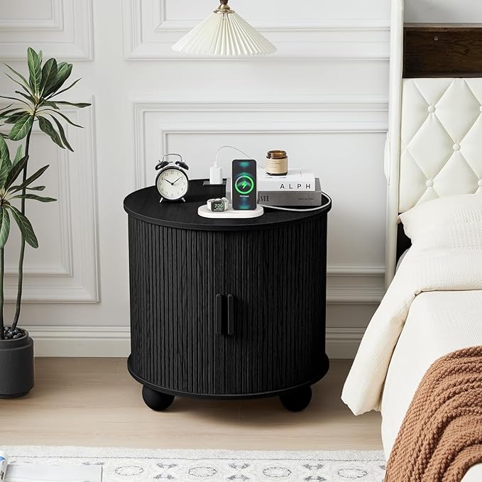 24" Large Fluted Round End Table with Charging Station, Farmhouse Cricle Sofa Side Table with Sliding Door and Storage, Rustic Curved Wood Nightstand for Living Room, Bedroom,Black