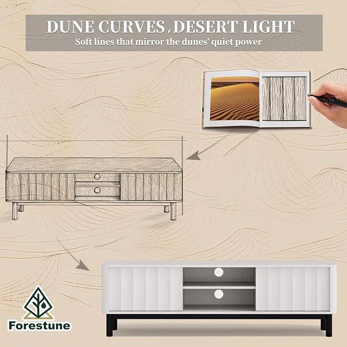 - DESERT-INSPIRED FLUTED DESIGN - The Forestune white TV stand channels the quiet power of sand dunes with soft, sculptural ridges that catch and diffuse light, turning your living room into a calming retreat with mid-century modern soul