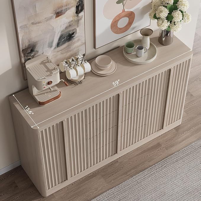 Buffet Cabinet with Storage, 60" Fluted Coffee Bar Cabinet with 4 Drawers & 2 Doors, Solid Wood Handle, Credenza Accent Storage Cabinet for Kitchen Living Dining Room, Natural Oak(1PCS)