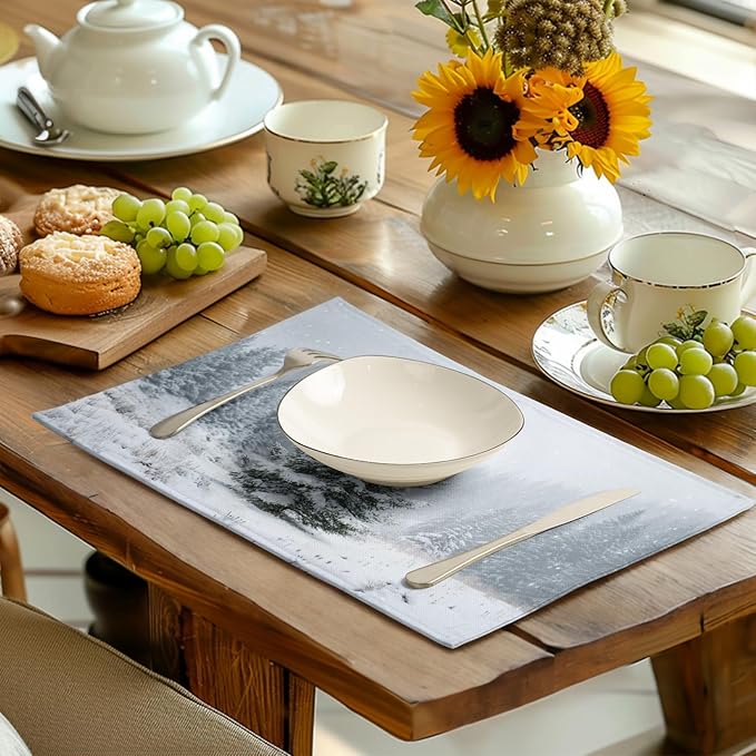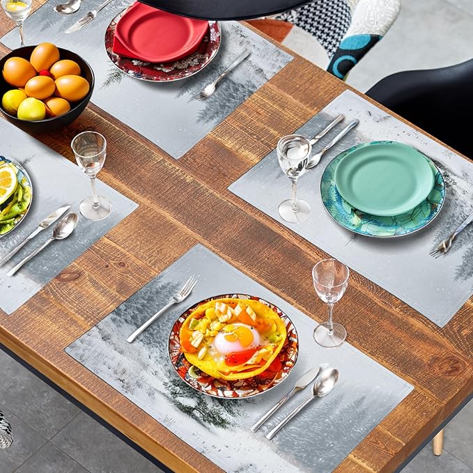 - TABLE DECORATION: Winter xmas table placemats feature high-definition printing technology for crisp, clear patterns and vibrant colors; rectangle placemats with a pine tree pattern; unique and eye-catching seasonal patterns add charm to farmhouse table place mats, creating a winter and Christmas atmosphere for your party