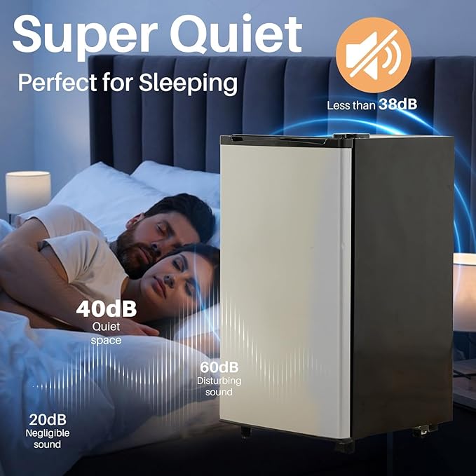 - π Quiet and Functional Design: Operating at a whisper-quiet noise level of 38 dB, the compact refrigerator is perfect for environments requiring minimal noise, such as bedrooms or shared office spaces.