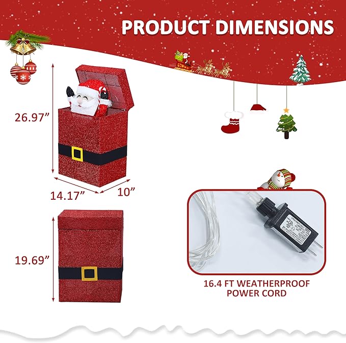 - Light Up Electric Santa Claus: This Santa Claus is a 3D shape which is decorated with Christmas gift box. Put it there to welcome your family and friends. Just plug it in, and the animated Santa in the gift box rises and falls-bringing the scene to life and adding extra magic to Christmas holidays. The 3D design makes the Santa Claus looks more vivid as an outdoor Xmas Decor