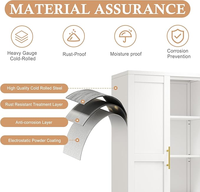 - đ˝ăNatural Elegant Spaceă It's time to get your house in order - both organizationally and decoratively. Our Kitchen Pantry Storage cabinets exude effortless sophistication with premium cold-rolled steel and eco-friendly powder coating. Metal accents add sophistication and enhance the overall visual appeal. This spacious storage cabinet boasts 3 fully adjustable internal shelves, allowing you to customize the space to suit your needs. With 4 shelves in one door, similar to a refrigerator door for easy access, this locker can hold everything from food and cutlery to kitchen utensils for your storage needs.