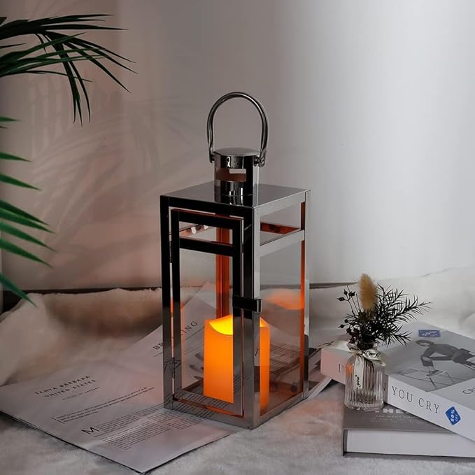 TRIROCKS Set of 2 Stainless Steel Decorative Lantern 12'' High Metal Hanging Lantern with Clear Glass Panels Perfect for Home Decor Living Room Parties Events Tabletop Indoors Outdoors (Silver)